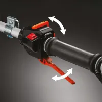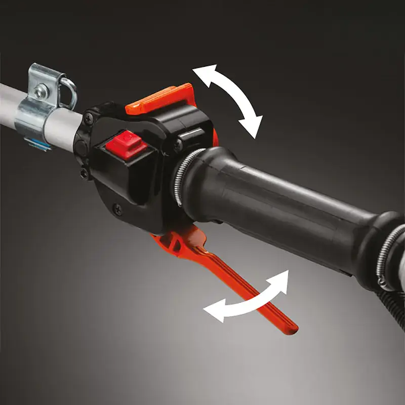 Регулируемая по высоте рукоятка D-образной формы обеспечивает свободу движения в различных направлениях, позволяя аккуратно выкашивать траву вокруг препятствий и в ограниченных пространствах. Перфорированный нож из высоколегированной стали с победитовыми напайками легко срезает стволы мелкого кустарника и бурьяна.