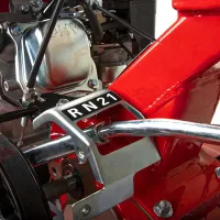 Бензиновый мотоблок оснащен сцепкой с тремя пальцами в комплекте. В передней части расположена сервисная рукоятка. Она нужна для удобной смены навесного оборудования. Мотоплуг обладает прочной конструкцией. Металлические шайбы изготовлены из металла и надежно защищают сальники редуктора от повреждений. Шкивы и трансмиссия с ременно-цепной передачей выполнены из чугуна.