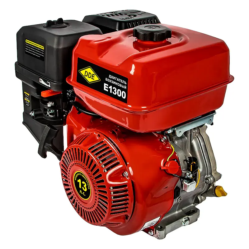 Двигатель бензиновый 4Т E1300-S25 (13 л.с., 389 куб. см, к/л 25 мм, шпонка) DDE 794-678 предназначен для использования в качестве привода на садово-парковой и строительной технике, например: мотоблоках, мотокультиваторах, снегоуборщиках, мотопомпах и виброплитах. Изделие отвечает современным техническим стандартам качества, обеспечивая долгий и безопасный эксплуатационный период. Не предназначен для коммерческой деятельности и деятельности, связанной с извлечением выгоды. Данные модели двигателей рекомендованы в качестве силового агрегата с наработкой до 300 часов в год. Увеличенный бак 6,5 литра. Вал двигателя 25 мм. Воздушный фильтр, датчик уровня масла, ручной стартер. Целевая аудитория - фермеры, изготовители техники малой механизации, картов, мотособак и прочих изделий с бензоприводом. Свеча зажигания DDE - LR7YC.