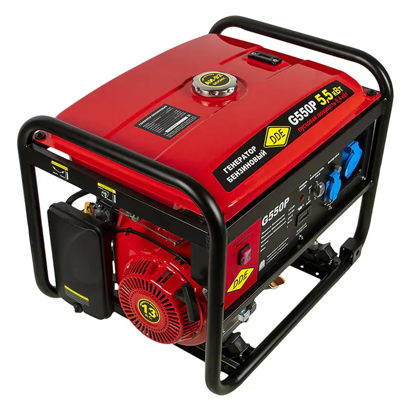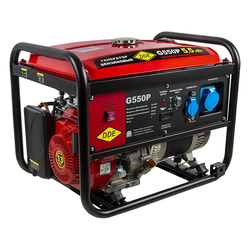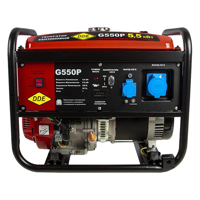 Бензиновый генератор DDE G550P разработан для питания однофазных потребителей суммарной мощностью 5 кВт. Для простого запуска 4-тактного двигателя предусмотрен электрический стартер. Модель поддерживает функцию AVR.