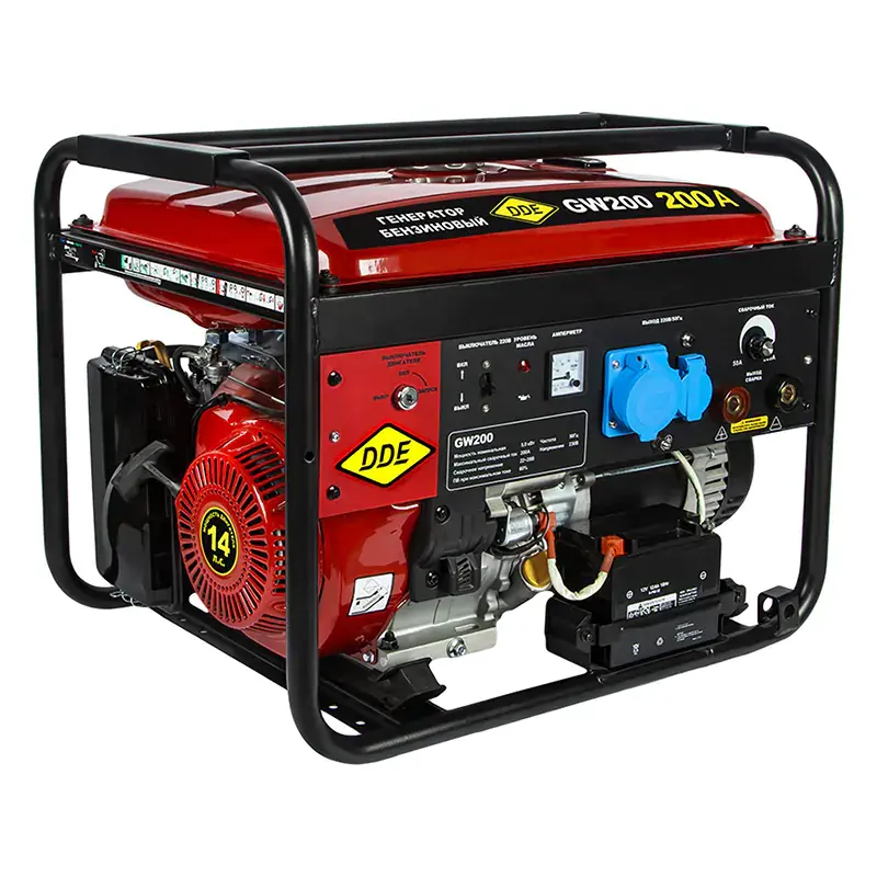 Сварочный генератор DDE GW200 совмещает в себе две функции: позволяет питать бытовую технику или электроинструмент, а также сваривать заготовки. Ток настраивается в диапазоне от 50 до 210 А. Есть электростартер для быстрого запуска двигателя.
