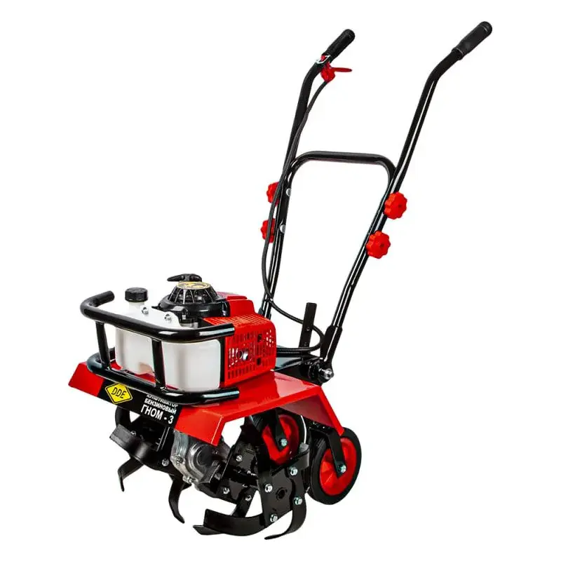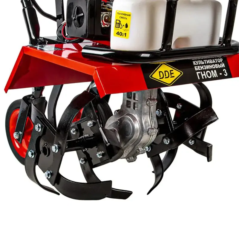 Культиватор DDE Гном - 3 оснащен двигателем мощностью 2,9 кВт. Модель с максимальной шириной вспашки 45 см рассчитана на участки площадью до 500 м2.