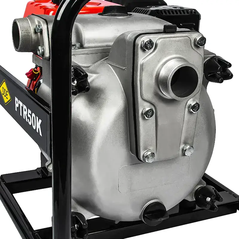 За счет прочной конструкции грязевая мотопомпа DDE PTR50K рассчитана на длительный срок службы. Сальники изготовлены из карбида кремния, крыльчатка из чугуна, а корпус сделан из силуминового сплава. Основные узлы надежно защищены прочной металлической рамой, которая огибает весь корпус.