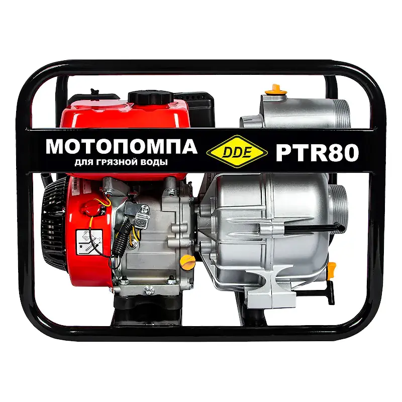 Бензиновая грязевая мотопомпа DDE PTR80 обладает производительностью 1080 л/мин и позволяет работать с водой, где допустимый диаметр частиц не превышает 28 мм. Высота всасывания составляет 5 м, а напор 26 м.