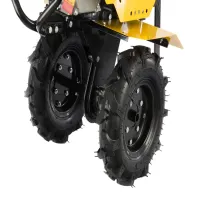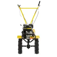 Мотоблок Denzel DPT-170S 56441 с двигателем мощностью 7 л. с., ременным механизмом сцепления, фрезами 3 х 4, шкивом отбора мощности (ШОМ) и коробкой передач 2В/1Н предназначен для проведения сельскохозяйственных работ. Максимальная ширина обработки составляет 1000 мм, глубина — 350 мм. Фрезы собираются из двух двойных и двух одинарных секций, что позволяет регулировать ширину вспашки.