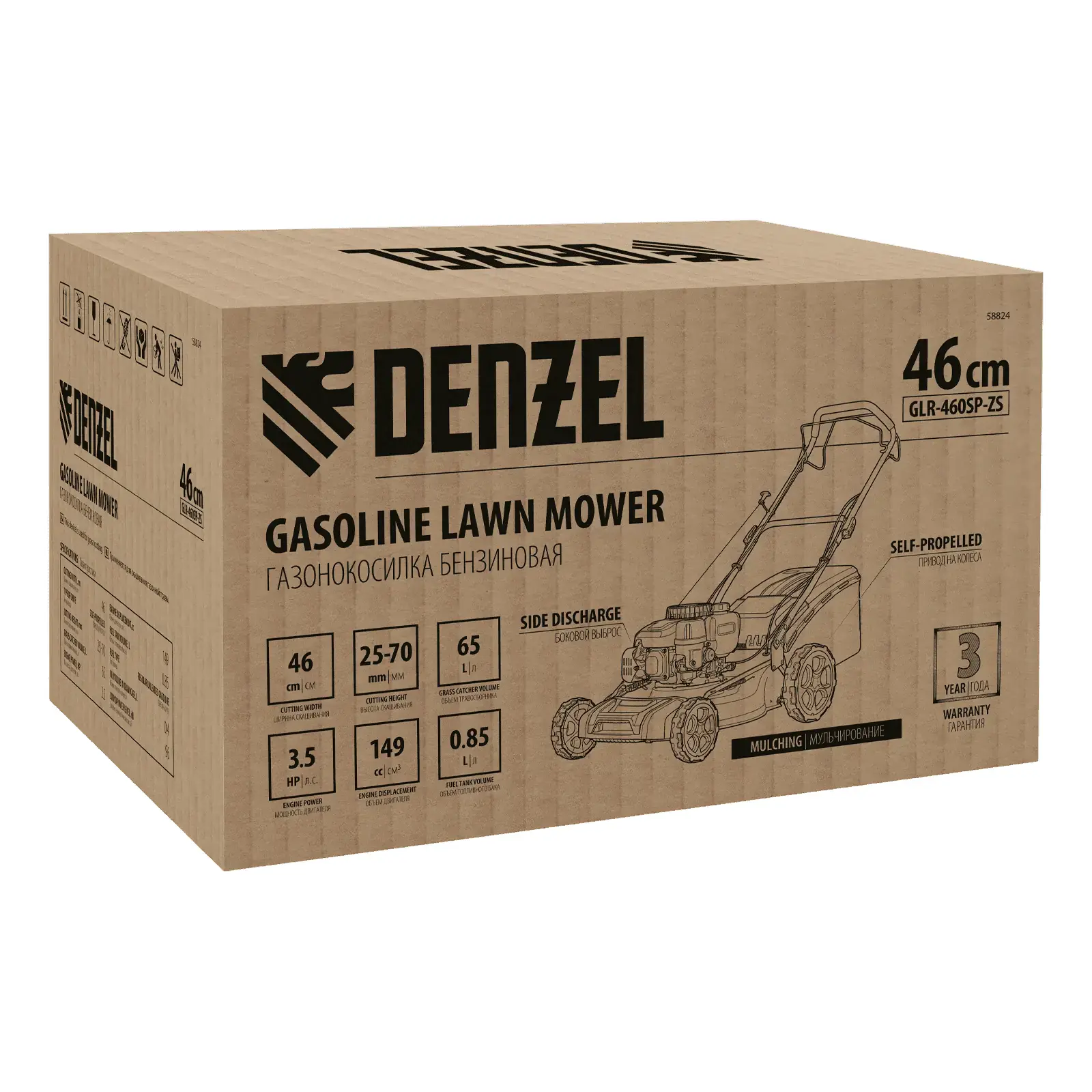 Бензиновая газонокосилка Denzel GLR-460SP-ZS 58824 с приводом на колеса и травосборником вместимостью 65 л, с надежным и экономичным 4-тактным двигателем объемом 149 см3, обеспечивает ширину прохода 46 см. Предназначена для стрижки газонов и скашивания травы в саду, будет полезна для ухода за дачным участком или придомовой территорией. Высота скашивания легко регулируется одним рычагом в диапазоне 25-70 мм (предусмотрено 8 уровней).