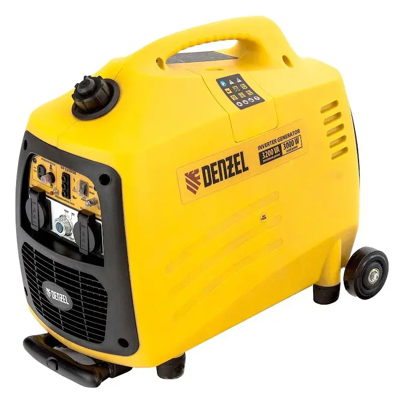 Инверторный генератор Denzel GT-3200iSE позволяет питать подключенное оборудование суммарной мощностью до 3 кВт. Модель оснащена колесами и выдвижной ручкой для простого перемещения по рабочей площадке.