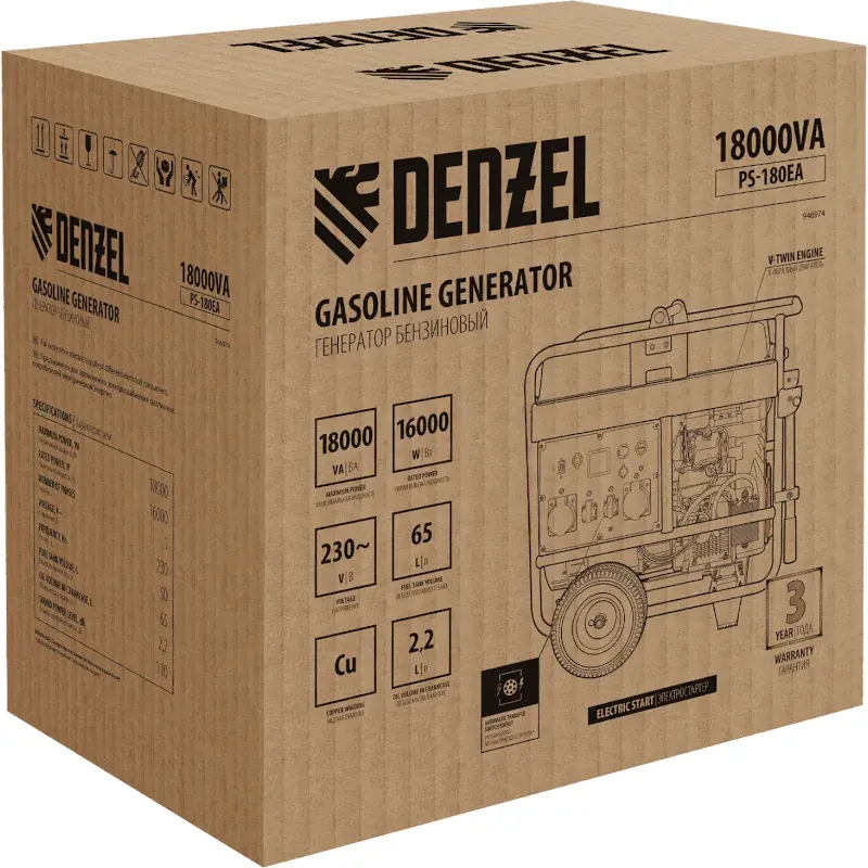 Бензиновый генератор Denzel PS-180EA 946974 максимальной мощностью 18 кВт, с баком объемом 65 л, разъемом ATS и электрическим стартером, поддерживает напряжение в сети 230 В. Предназначен для обеспечения питанием приборов и оборудования в случае отсутствия стационарной сети или перебоев в ее работе. Разъем USB 5 В позволяет заряжать мобильные устройства. Подключение потребителей производится при помощи 2-х розеток 230 В/16 А, а также 2-х силовых розеток 230 В/32 А.