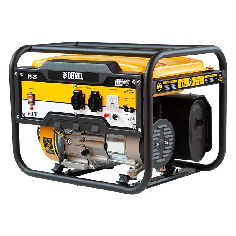 Для защиты от скачков напряжения предусмотрен блок AVR. За счет этого подключенная к бензогенератору DENZEL PS-25 техника не выйдет из строя, а двигатель модели не будет подвержен перегрузке.