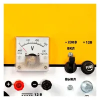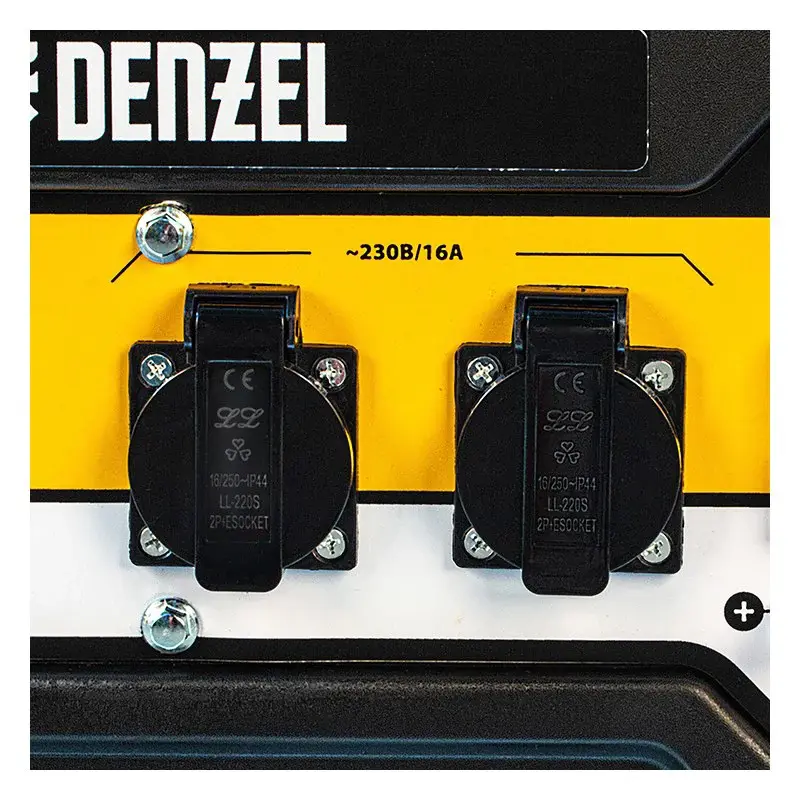 Для подключения техники на корпусе бензинового электрогенератора расположено две розетки 230 В. Выходы оснащены защитными крышками, которые плотно закрываются и не допускают попадания пыли, грязи или влаги внутрь. Рядом с розетками расположен вольтметр для отслеживания текущего напряжения. Для подзарядки севшего автомобильного аккумулятора предусмотрен выход на 12 В.