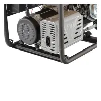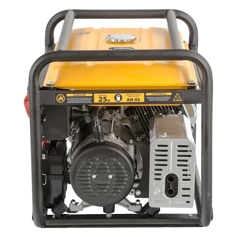 По периметру модель обнесена усиленным стальным каркасом. Диаметр рамы составляет 32 мм. Такая компоновка надежно защищает генератор от ударов и механических повреждений. Есть возможность установки транспортировочных колес и ручек. Их необходимо приобретать отдельно.