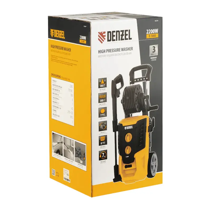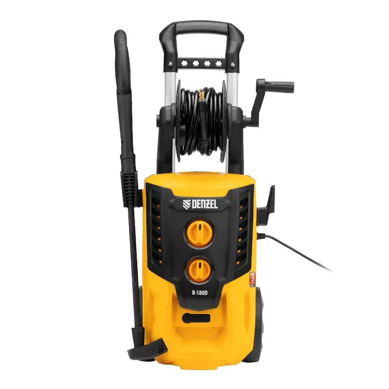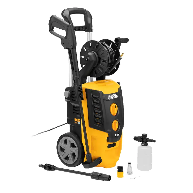 Моечная машина высокого давления Denzel R-180D подает воду под напором 180 бар с производительностью 380 л/ч. Колеса и ручка облегчают перемещение аппарата по участку.
