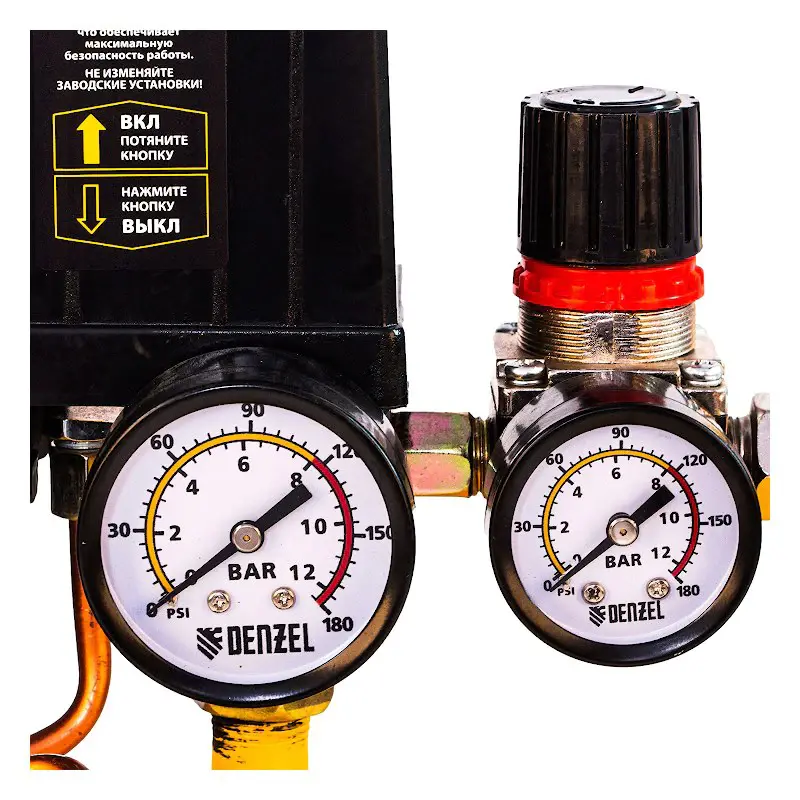 Поршневой компрессор Denzel Х-PRO DK1500/50 оснащен двумя манометрами. Один позволит отслеживать давление в ресивере, а второй на выходе.