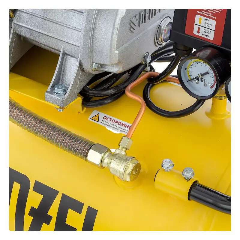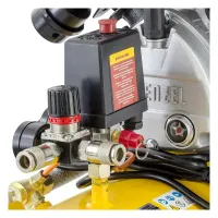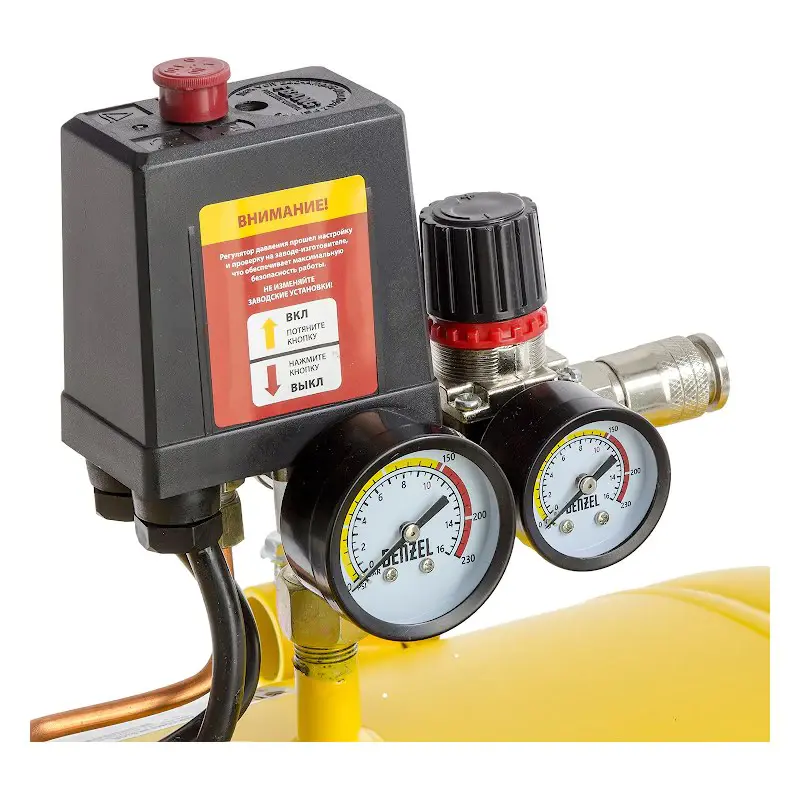 Реле давления поддерживает работу компрессора в автоматическом режиме. Максимальный уровень сжатия воздуха составляет 8 бар. На выходе установлен редуктор с поворотным регулятором для уменьшения давления, подаваемого в пневмоинструмент. Два манометра позволяют контролировать давление в ресивере и на выходе.