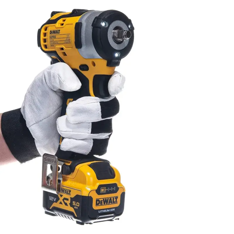 Компактные размеры аккумуляторного гайковерта DeWalt позволяют подобраться к крепежу в труднодоступных местах при обслуживании техники. Устройство имеет сбалансированный корпус и удобную рукоятку. При включении инструмента загорается подсветка, состоящая из трех ярких светодиодов. Благодаря освещению рабочей зоны крепеж всегда хорошо виден в любых условиях.