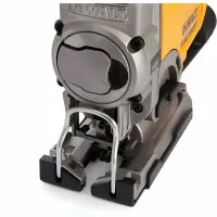 В конструкции аккумуляторного лобзика предусмотрен патрубок для подключения строительного пылесоса или пылесборного мешка. Уборка опилок и пыли в процессе работы важна для здоровья и удобства мастера. Рукоятка лобзика DeWalt DCS331N с нескользящим покрытием из резины обеспечивает уверенный хват. Направляющий ролик находится в нижней части инструмента, что позволяет избежать деформации пильного полотна.