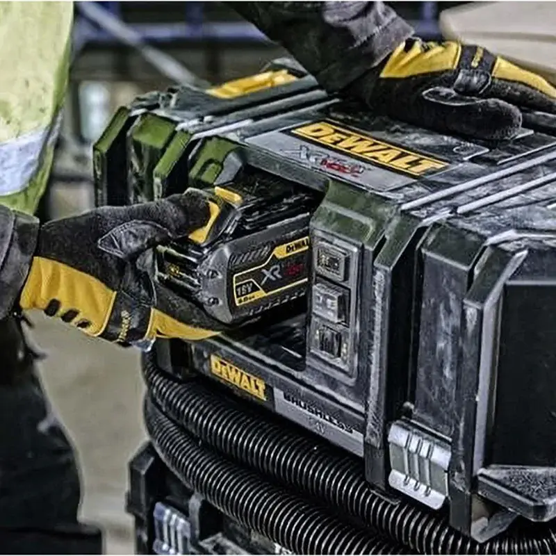 Корпус стандартной формы совместим с ящиками и системами хранения TSTAK. Боковые защелки позволяют прикреплять к пылесосу другие изделия для компактного размещения и удобства переноски. Пылесос DeWALT DCV586MN работает с аккумуляторами, совместимыми с другими устройствами производителя. Приобретая одну батарею, можно обеспечить источником питания сразу несколько аккумуляторных инструментов.