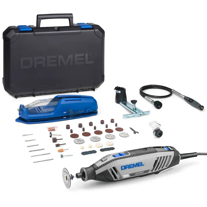 Многофункциональный инструмент Dremel 4250 F0134250JJ относится к виду прямых шлифовальных машин-граверов и предназначен для самых различных работ. Режьте,сверлите,шлифуйте,затачивайте,полируйте и гравируйте с помощью 45 высококачественных насадок Dremel,входящих в комплект поставки. Кейс позволяет легко переносить и хранить все насадки и приставки.Для частого применения используйте настенное крепление. Универсальная направляющая для резки (565) и фрезерный циркуль с параллельным упором (678) помогут выполнить задачи, требующие высокой точности.