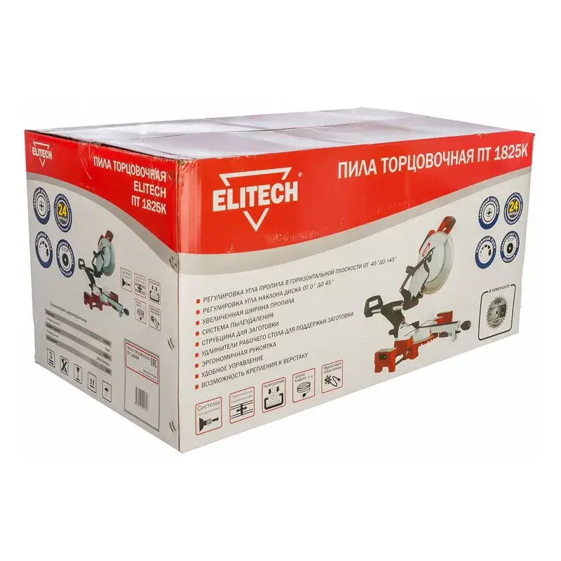 Торцовочная пила Elitech ПТ 1825К обладает диском диаметром 255 мм, который обеспечивает максимальную глубину пропила – 75 мм. Для работы с крупными изделиями есть протяжный механизм. Максимальная точность реза обеспечивается лазерным целеуказателем.