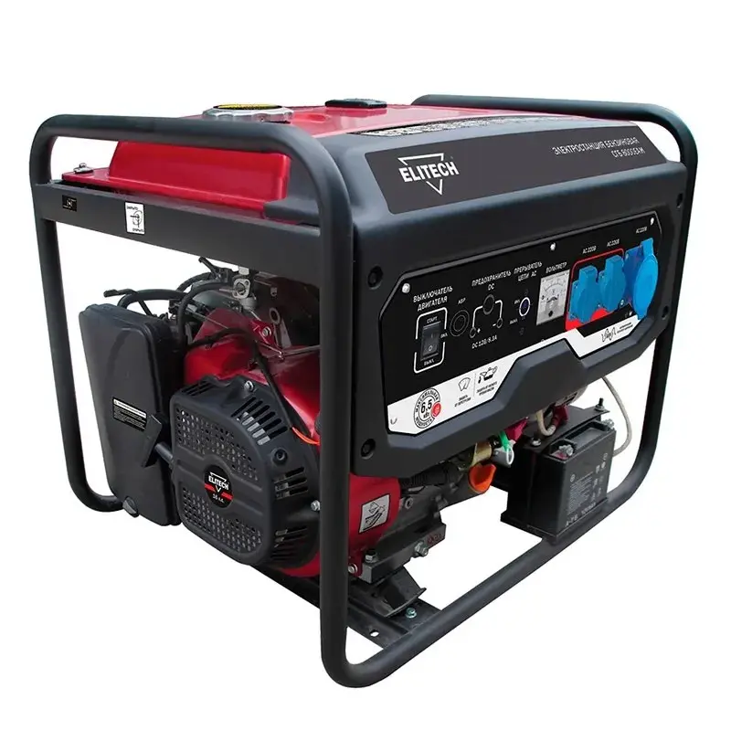 Генератор Elitech СГБ 8000ЕАМ обладает мощностью 6 кВт. Оборудование подходит для автономного и аварийного снабжения током. Оснащен 2 типами розеток на 220 В и 12 В, что позволяет подключать приборы разной мощности.