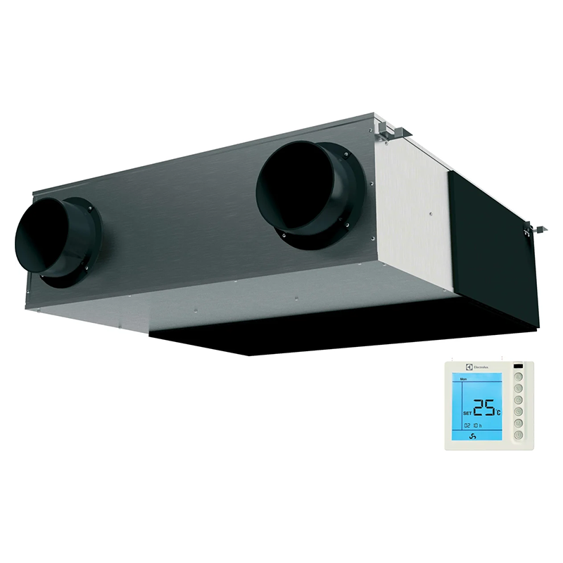 В установке имеется две скорости вращения вентиляторов, возможность управления внешним электронагревателем (поставляется отдельно) и электронная защита рекуператора от обмерзания.