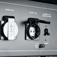 Для подключения бытовой техники или домашнего инструмента на корпусе есть 2 пылезащитные розетки на 220 В. Рядом с ними расположен цифровой дисплей, который позволяет отслеживать все основные рабочие параметры: напряжение, частоту, а также просматривать счетчик моточасов и индикатор уровня масла.