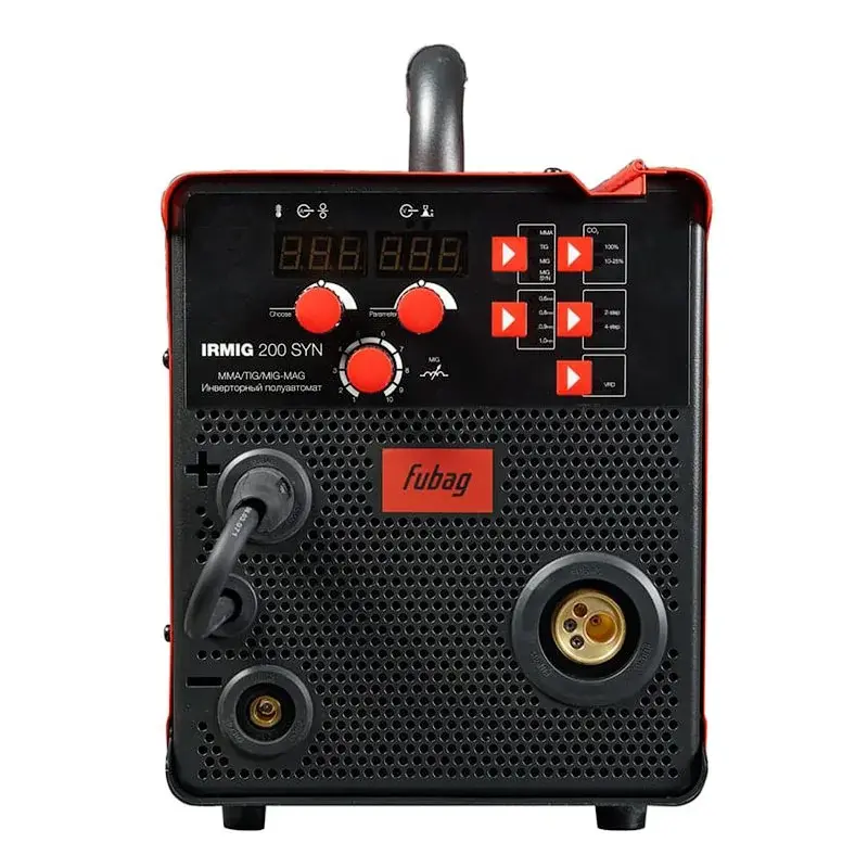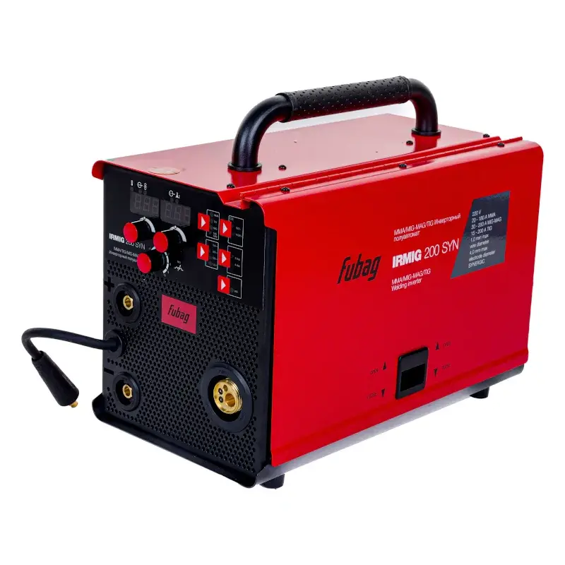 FUBAG IRMIG 200 SYN 31447.1 имеет прочный металлический корпус, защищающий внутренние элементы от повреждений. Безопасному подключению кабелей и горелки способствуют удобные евроразъемы из термостойкого пластика. Тоннельная система охлаждения обеспечивает эффективный отвод тепла и защищает устройство от перегрева.
