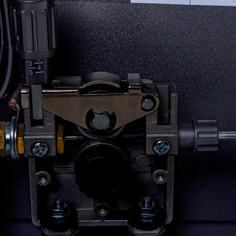 Два цифровых экрана на передней панели отображают напряжение и ток. Для изменения скорости подачи тока, напряжения и индуктивности предусмотрены поворотные регуляторы. Тип сварки, толщину проволоки и вид газа можно задать с помощью кнопок. Модель имеет надежный металлический механизм подачи проволоки, подходит для катушек 100 и 200 мм.
