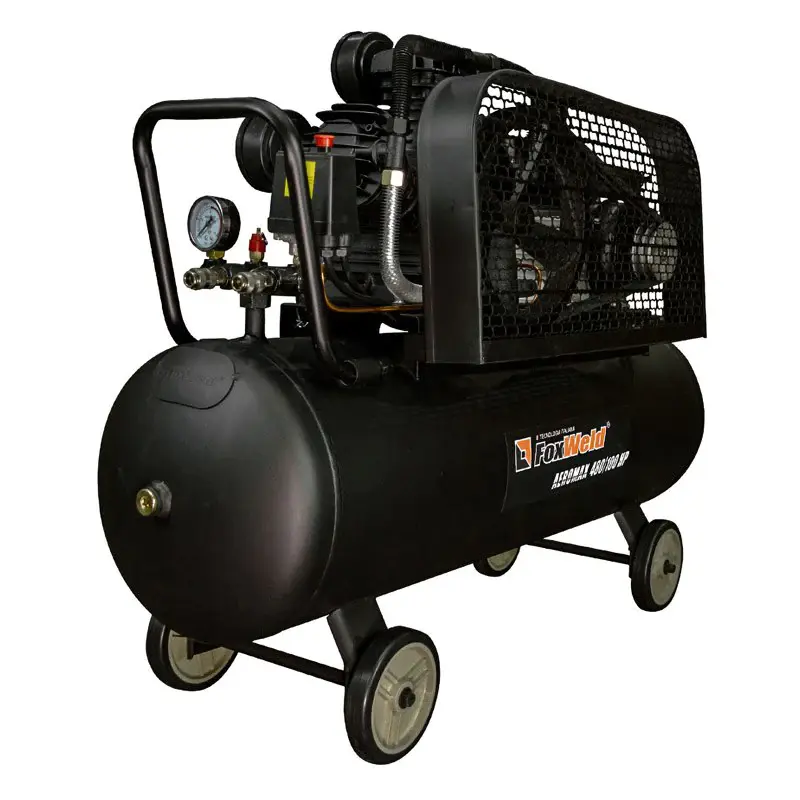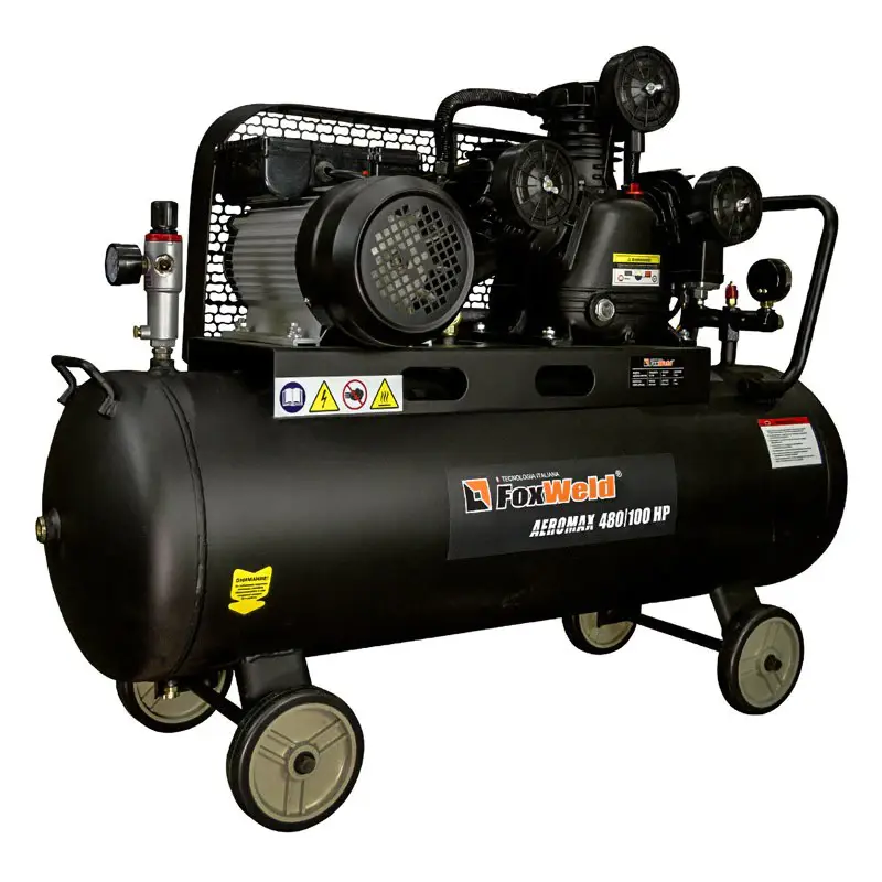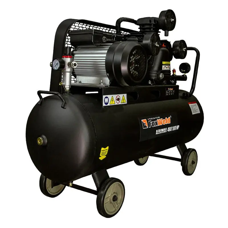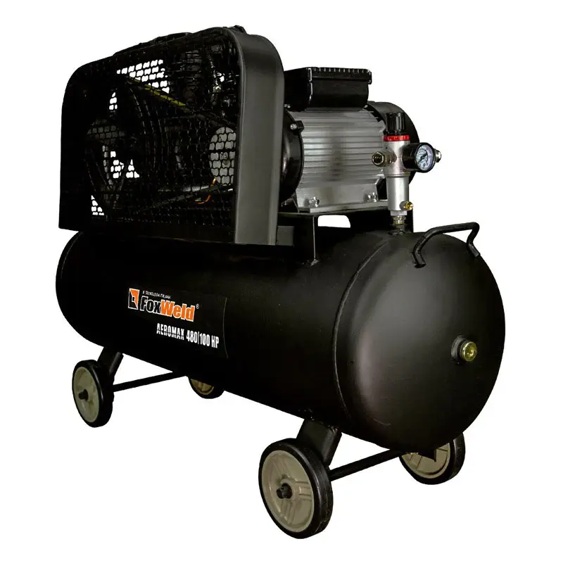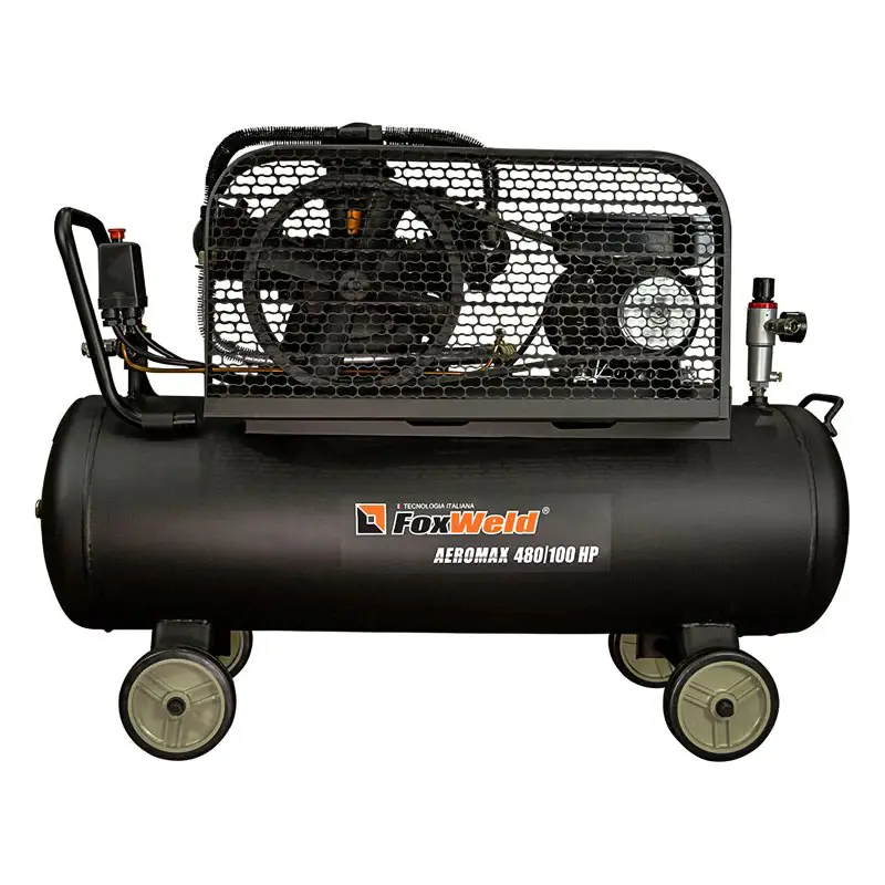 Масляный ременной компрессор FoxWeld AEROMAX 480/100 HP нагнетает атмосферный воздух в стальной ресивер объемом 100 л и подает его под давлением до 10 бар в пневмоинструменты, пневмоприводы и пневмооборудование. Производительности 480 л/мин достаточно для работы плазмореза, отбойного молотка, гайковерта с высоким крутящим моментом или хоппер-ковша.