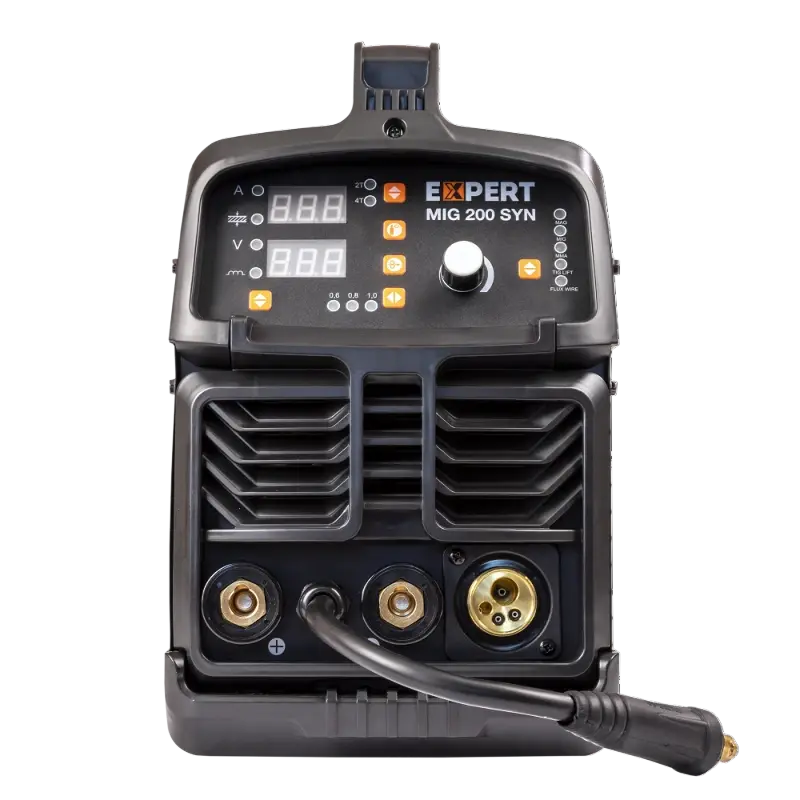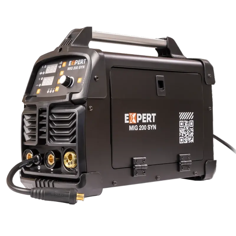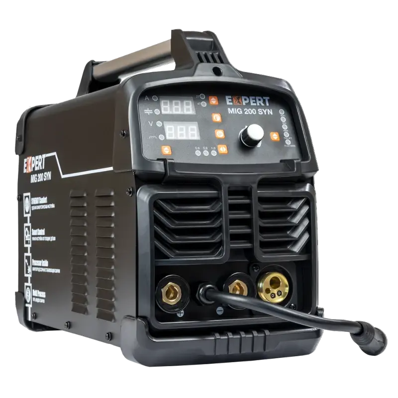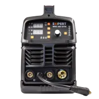 Сварочный полуавтомат EXPERT MIG 200 SYN — это инверторный источник питания с синергетическим режимом управления, позволяющий производить сварку, используя инверторную технологию преобразования и управления сварочным током. При этом аппарат обеспечивает идеальные параметры сварки даже при большом падении входящего напряжения, особенно на малых токах, при сварке небольших толщин. Аппарат позволяет проводить полуавтоматическую сварку (MIG/MAG) сплошной проволокой в среде защитного газа, полуавтоматическую сварку (FLUX WIRE) самозащитной проволокой без использования защитного газа, ручную дуговую сварку (ММА) на постоянном токе штучным электродом с рутиловым и основным покрытием и аргонодуговую сварку (TIG Lift) на постоянном токе с возбуждением дуги касанием вольфрамового электрода. Два цифровых дисплея на панели управления отображают значения сварочного тока, напряжения и параметров сварки.