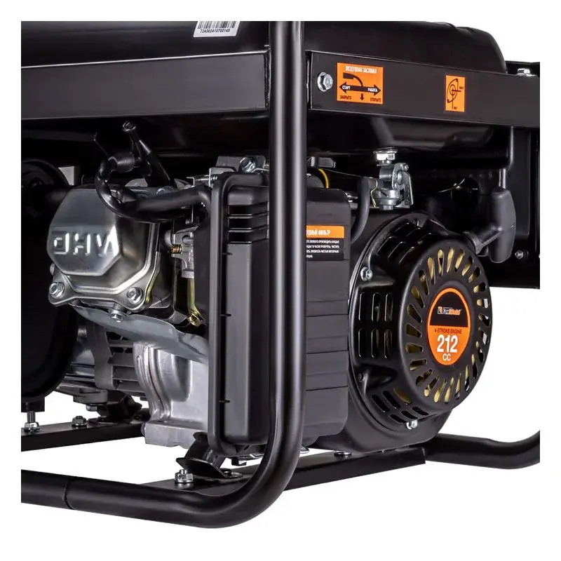 Для защиты генератора от механических повреждений есть прочная рама. Труба составляет 25 мм в диаметре и огибает весь корпус. Верхняя часть рамы используется в качестве держателя при переноске модели.