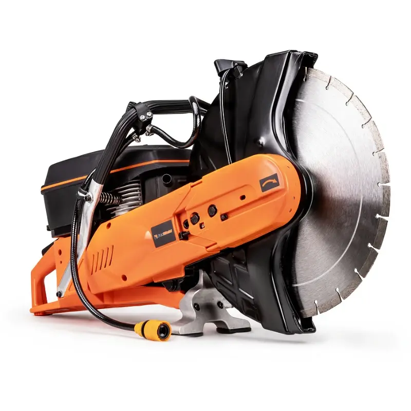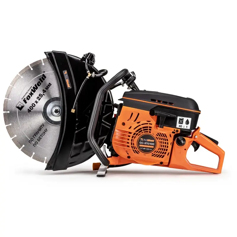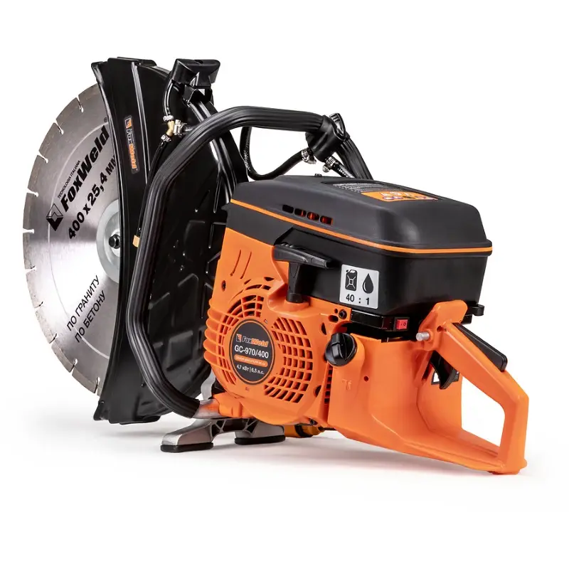 Foxweld GC-970/400 - мощный универсальный бензорез с идеальным соотношением мощности к весу. Японская комплектация, антивибрационная система, двухсторонняя подача воды, трёхступенчатая очистка воздуха и декомпрессионный клапан - в бензорезе GC-970/400 есть всё для эффективной работы. Предназначен для сухой и мокрой резки бетона, гранита, кирпича, строительных блоков, бордюров, асфальта, камня и др., с применением алмазного или зубчатого диска диаметром 350/400 мм. При использовании специальных абразивных дисков диаметром 355/400 мм применяется и для резки чугуна, стали, алюминия и др. материалов.