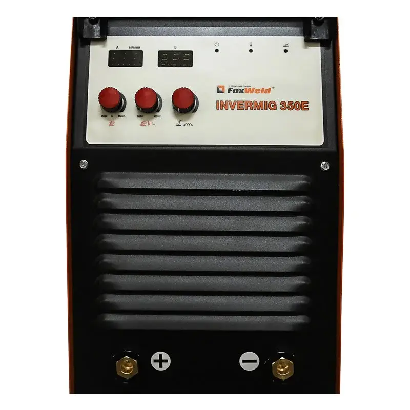 Сварочный аппарат FoxWeld Invermig 350E имеет две многофункциональные панели управления с четырьмя цифровыми дисплеями, пятью поворотными регуляторами, переключателями и индикаторами.