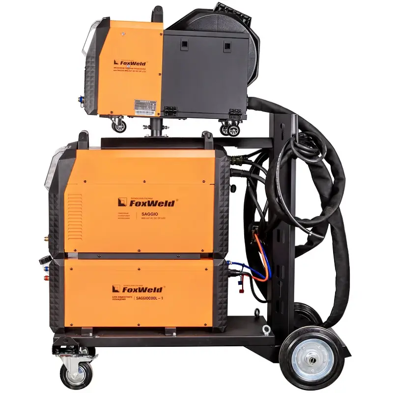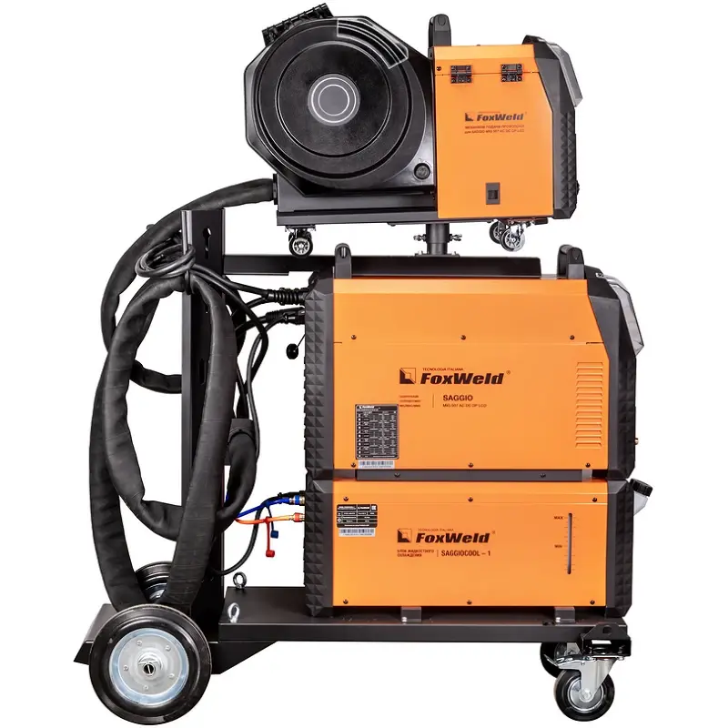 Сварочный полуавтомат FOXWELD SAGGIO MIG 507 AC DC DP LCD — это многофункциональный инверторный аппарат для электродуговой сварки (МIG/МAG, TIG, ММA). Наличие специальных сварочных процессов, импульсного и двойного импульсного режимов повышают качество и производительность сварки при решении технологически сложных производственных задач. LCD панели на источнике и механизме подачи повышают оперативность доступа к настраиваемым параметрам. Подключаемый блок жидкостного охлаждения позволяет комфортно работать сварочной горелкой на больших токах. Отдельный механизм подачи на колёсах даёт возможность работать на удалении от источника питания, а тележка повышает мобильность аппарата.