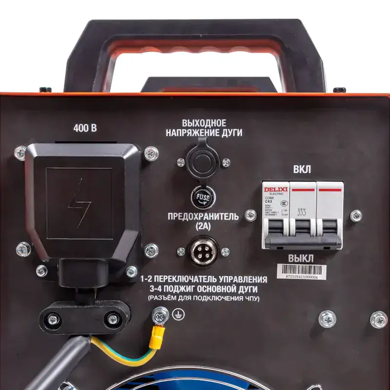 Аппарат имеет переключатель режимов управления циклом резки - 2Т/4Т. Также имеются силовые клеммы 35-50мм2 для подключения надежной клеммы заземления.