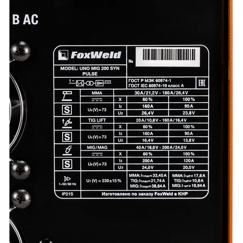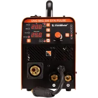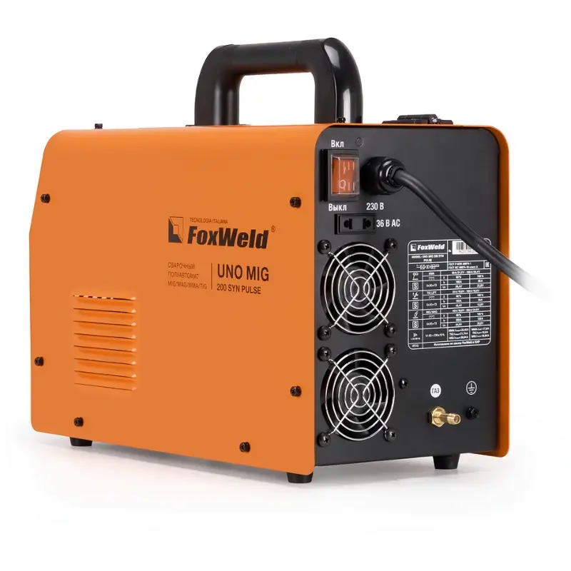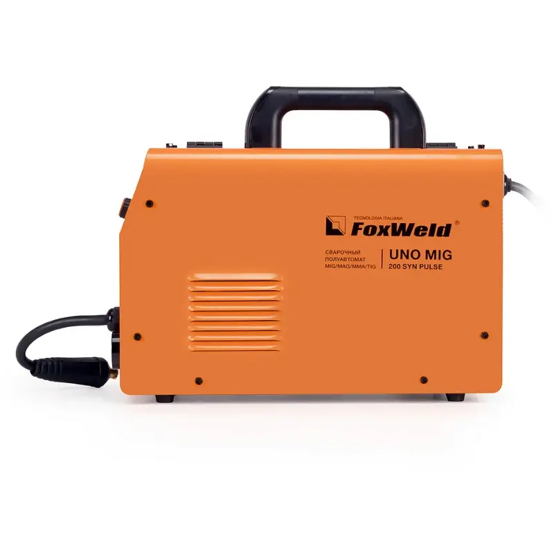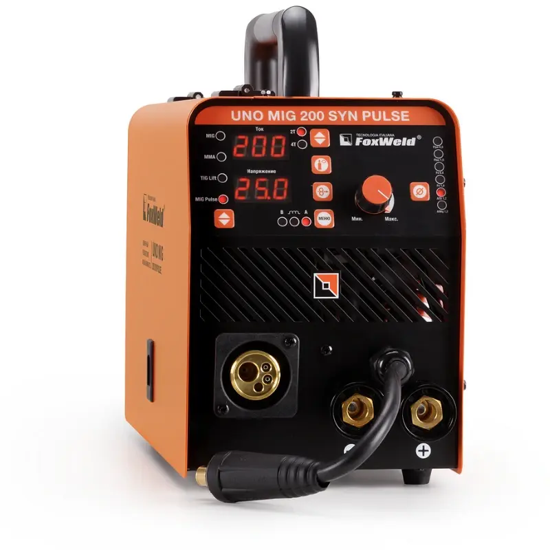 Сварочный полуавтомат FOXWELD UNO MIG 200 SYN PULSE – это многофункциональный импульсный аппарат с синергетическим управлением, предназначенный для сварки изделий из сталей, а также алюминиевых сплавов. UNO MIG 200 SYN PULSE позволяет проводить следующие виды работ: полуавтоматическую сварку (МIG/МAG) сплошной и самозащитной проволокой с синергетическим управлением основными параметрами сварки, полуавтоматическую сварку в импульсном режиме (MIG Pulse), ручную дуговую сварку (ММА) на постоянном токе штучным электродом с рутиловым и основным покрытием и аргонодуговую сварку (ТIG LIFТ) на постоянном токе с возбуждением дуги касанием вольфрамового электрода. Импульсный режим позволяет получить управляемый перенос материала без разбрызгивания с высокой концентрацией сварочной дуги и идеально подходит для сварки алюминиевых сплавов. Режим TIG LIFТ позволяет производить сварку изделий из черной и нержавеющей стали для получения презентабельного внешнего вида шва.
