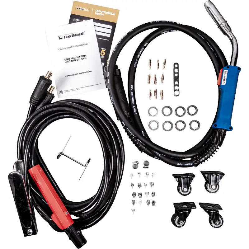 Горелка, хомуты для газового шланга, комплект роликов и наконечников позволяют быстро приступить к работе.