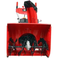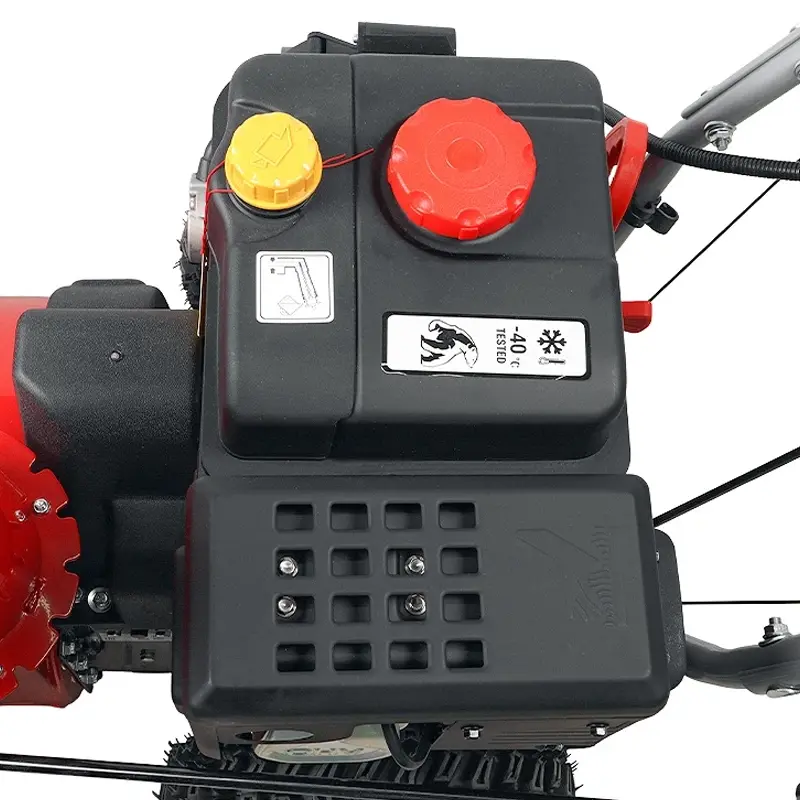 Крепкие металлические зубья шнека рассекают и загребают снег любой плотности. Регулятор поворота желоба позволяет изменять направление откидывания снежной массы. Высоту и дальность выброса можно настроить путем изменения угла наклона козырька дефлектора. Рассекатель на выходном отверстии разгрузочного желоба предотвращает вылет крупных ледышек и получение травм. Сменные срезные болты предохраняют редуктор от поломки в случае превышения допустимой нагрузки на шнек.