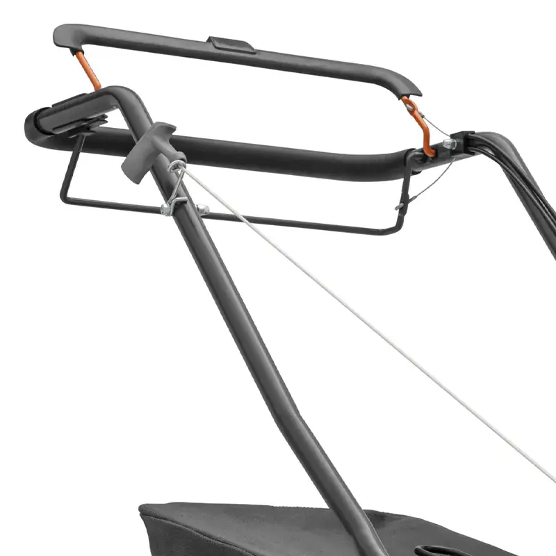Бензиновая газонокосилка проста в управлении. Рычаги для контроля работы привода находятся в легком доступе: на рукояти прямо перед вашими глазами. Ее высоту можно настроить под ваш рост. Переключатель уровня кошения расположен на видном месте рядом с колесом. На передней части корпуса у модели есть захват для поднятия или транспортировки инструмента. А для компактного хранения рукоять можно быстро и легко сложить.