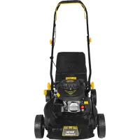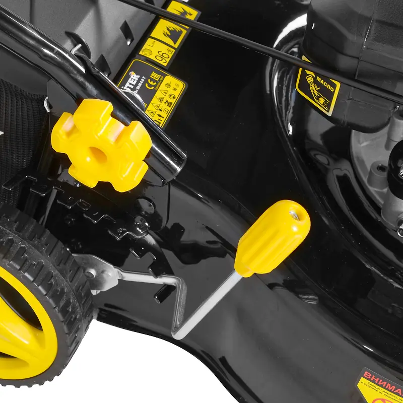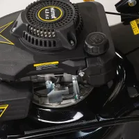 Бензиновая газонокосилка легко заводится благодаря системе быстрого старта. Для остановки двигателя достаточно просто отпустить прижимной рычаг. Вращение ножа мгновенно остановится. Рычаг для регулировки высоты среза травы, расположенный около заднего колеса, имеет пять фиксированных положений. Дека косилки поднимается над землей на нужный уровень одним движением. Большая ширина скашивания позволяет быстрее обработать участок за меньшее число проходов.