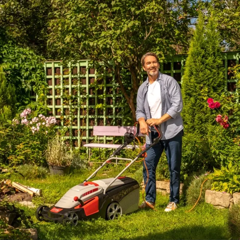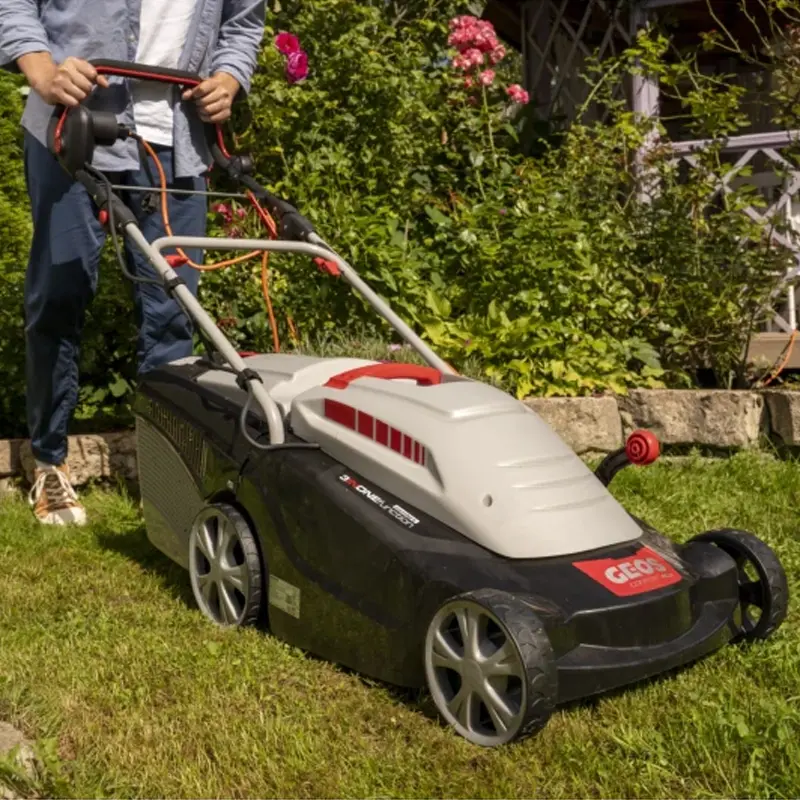 Это модельный ряд GEOS классом мощности до 1600 Вт, они прекрасно движутся по траве, не нагреваются, бесшумные, работают без выхлопных газов и без моторного масла. Не нужно делать перерывы на подзарядку аккумулятора или заправку топливного бака, а значит и нет дополнительного веса от аккумулятора или полного бензобака, ведь газонокосилка питается от электричества.