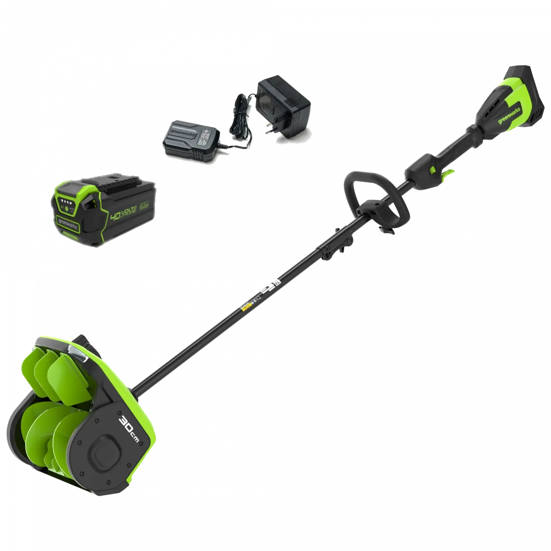 Снегоуборочная лопата Greenworks GD40SS2 позволяет сэкономить время и силы на расчистку снега перед домом или гаражом. Удлиненный прямой черенок избавляет от необходимости наклоняться и напрягать спину. Зарядное устройство и 40-вольтовый аккумулятор емкостью 4 Ач входят в комплект поставки. Снегоуборщик с шириной обработки 30 см оснащен блокировкой выключателя, яркими светодиодными фарами, регуляторами скорости и направления выброса снега.