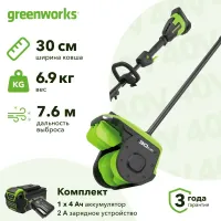 Снегоуборочная лопата Greenworks GD40SS2 позволяет сэкономить время и силы на расчистку снега перед домом или гаражом. Удлиненный прямой черенок избавляет от необходимости наклоняться и напрягать спину. Зарядное устройство и 40-вольтовый аккумулятор емкостью 4 Ач входят в комплект поставки. Снегоуборщик с шириной обработки 30 см оснащен блокировкой выключателя, яркими светодиодными фарами, регуляторами скорости и направления выброса снега.