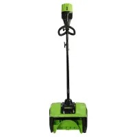 Установка аккумулятора для запуска устройства занимает считанные секунды благодаря удобному механизму фиксации. Электролопата Greenworks имеет кнопку блокировки во избежание случайного запуска. Скорость вращения шнека регулируется силой нажатия на курковый выключатель. Ковш на полозьях плавно движется по поверхности, поэтому для уборки снега не требуется прикладывать особых усилий.