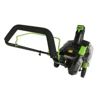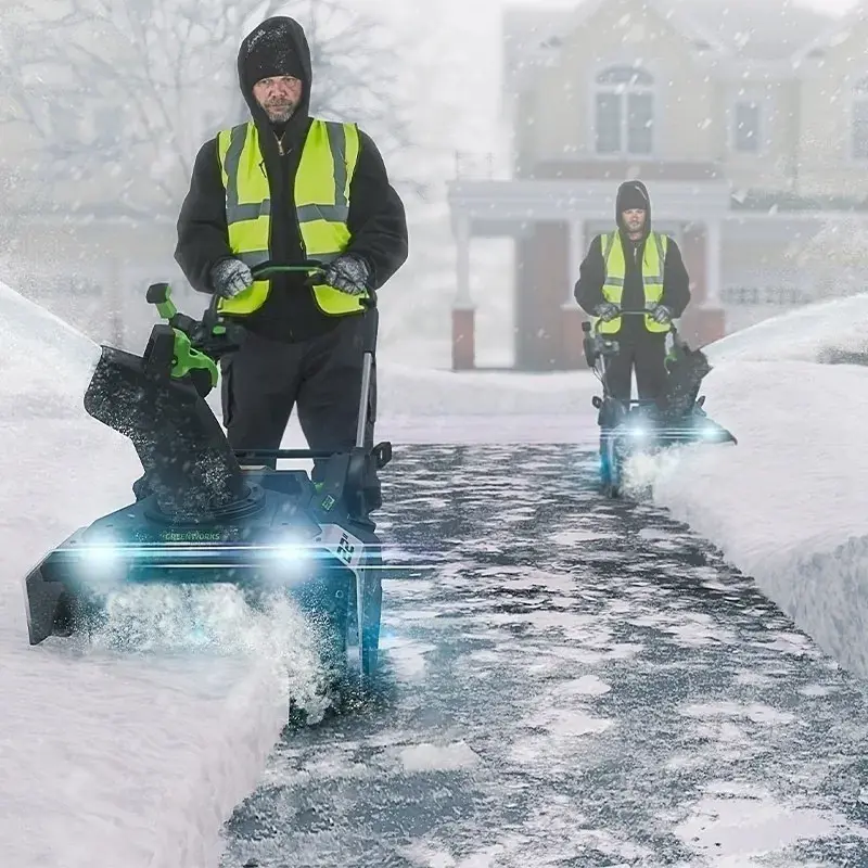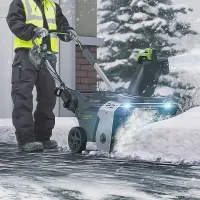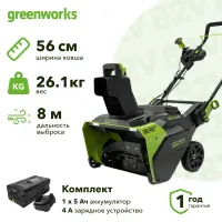 Аккумуляторный снегоуборщик GreenWorks GD82 поставляется с батареей и зарядным устройством, которые совместимы со всей техникой серии 82V. Одноступенчатый механизм за один проход счищает сугробы глубиной до 33 см и отбрасывает их на расстояние до 9 м.
