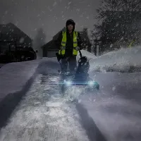 Мощные LED фары обеспечивают хорошую видимость даже при недостатке внешних источников света. Прочные колеса из литой пластмассы не впитывают влагу и не замерзают при отрицательных температурах. Складная рукоятка облегчает транспортировку и хранение прибора.