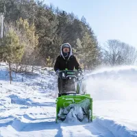 Аккумуляторный снегоуборщик Greenworks движется самостоятельно вперед и назад. При включении заднего хода звучит предупредительный сигнал. На панели оператора расположены все необходимые элементы управления — переключатели скорости движения и вращения шнека, рычаги настройки дальности выброса снега и кнопки включения фар. Разгрузочный желоб можно поворачивать на 200° при помощи удобной рукоятки. Функция разблокировки колес позволяет без усилий разворачивать машину на месте. Прикрепленный к ковшу инструмент «3 в 1» — лопатка, щетка и скребок — помогает удалить засоры, смахнуть снег, очистить снегоуборщик от наледи.