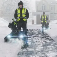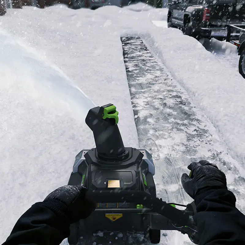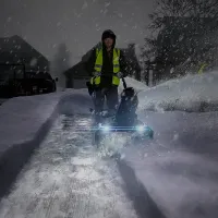 Аккумуляторный снегоуборщик имеет простое управление — достаточно нажать кнопку для включения привода шнека. Светодиодные фары загораются при запуске двигателя и ярко освещают рабочую зону в сумерках. Дальность выброса можно отрегулировать при помощи нажимной ручки. Рычаг управления поворотом желоба удобно расположен под правой рукой. Благодаря системе блокировки двигатель мгновенно останавливается при чрезмерной нагрузке. Например, в случае попадания в механизм твердого предмета — большого камня или куска льда.