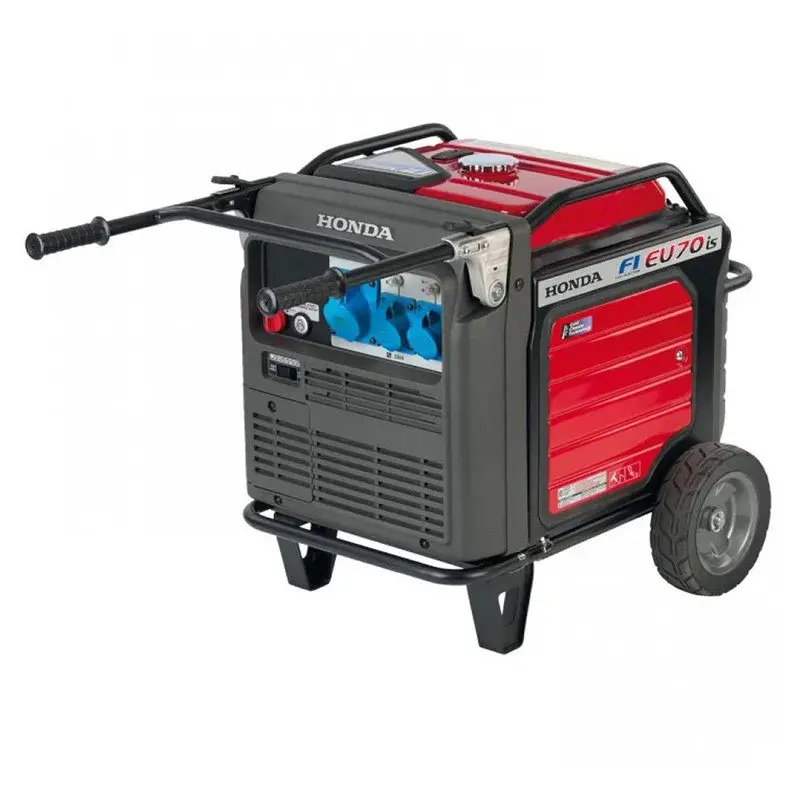 Самый большой инверторный генератор серии EU. При выходной мощности в 7000 Вт EU70i является идеальным решением для всех крупных кемперов, фургонов, мобильных торговых точек, организации вечеринок и т.д. Благодаря использованию технологии Sine-Wave для обеспечения бесперебойного и качественного электропитания модель EU70is надежно питает электричеством чувствительное к частоте и напряжению оборудование, такое как компьютеры и коммуникационное оборудование, а также идеально выполняет функцию источника резервного питания домашних хозяйств. Высокая мощность Максимальная мощность генератора достигает 7,0 кВА благодаря применению новых более мощных магнитов генератора, нового инвертора с меньшими потерями, системы электронного впрыска топлива, корректировке угла опережения зажигания. Новейшие технологии Honda Современная система впрыска топлива позволяет устройству работать непрерывно до 18 часов (в зависимости от нагрузки), при этом минимизирована необходимость технического обслуживания. Система предупреждения об уровне масла отключает двигатель при критическом снижении уровня масла. I-Monitor™ предоставляет информацию о часах работы, мощности и оборотах двигателя, а также о необходимости диагностики для упрощения технического обслуживания у дилеров. Система EcoThrottle автоматически регулирует частоту оборотов двигателя в зависимости от нагрузки. Интеллектуальная адаптация оборотов двигателя к электрической нагрузке позволяет экономить топливо и обеспечивает более продолжительную автономную работу. Генератор будет расходовать количество топлива в зависимости от мощности подключенного прибора. В режиме ECO при работе без нагрузки система автоматически переводит двигатель в режим холостого хода. После подключения потребителя тока двигатель автоматически набирает обороты, необходимые для достижения соответствующей выходной мощности. Этот режим рекомендован для достижения максимальной экономии топлива при работе генератора. Циклоконверторная и инверторная технологии Honda История началась в 1964 году, когда компания Honda представила свой первый компактный генератор. Все эти годы Honda проводила широкомасштабные исследования, результатом которых в 1987 году стал первый в мире инверторный генератор EX300, обладающий небольшим весом, компактными габаритами, а также предоставляющий стабильное и однородное питание для любых электроприборов. Компания Honda разработала две эксклюзивные революционные технологии: циклоконверторную и инверторную. И теперь речь идет не о том, чтобы изменить, а о том, чтобы с помощью электроники полностью пересмотреть старые фундаментальные принципы работы генераторов переменного тока для приближения к синусоидальному току. Например, частота тока больше не зависит от оборотов двигателя, а определяется электронным генератором импульсов. Инверторная технология позволяет, помимо получения идеального тока, подчинить режим работы двигателя потребности в токе. Она в значительной мере является источником удивительных характеристик серии EU. К такому генератору можно подключать любые сложные приборы, в которых присутствует чувствительная электроника. Инверторные генераторы имеют целый ряд преимуществ в сравнении с традиционными генераторами, например, они менее шумные, компактнее, легче и экономичнее. 