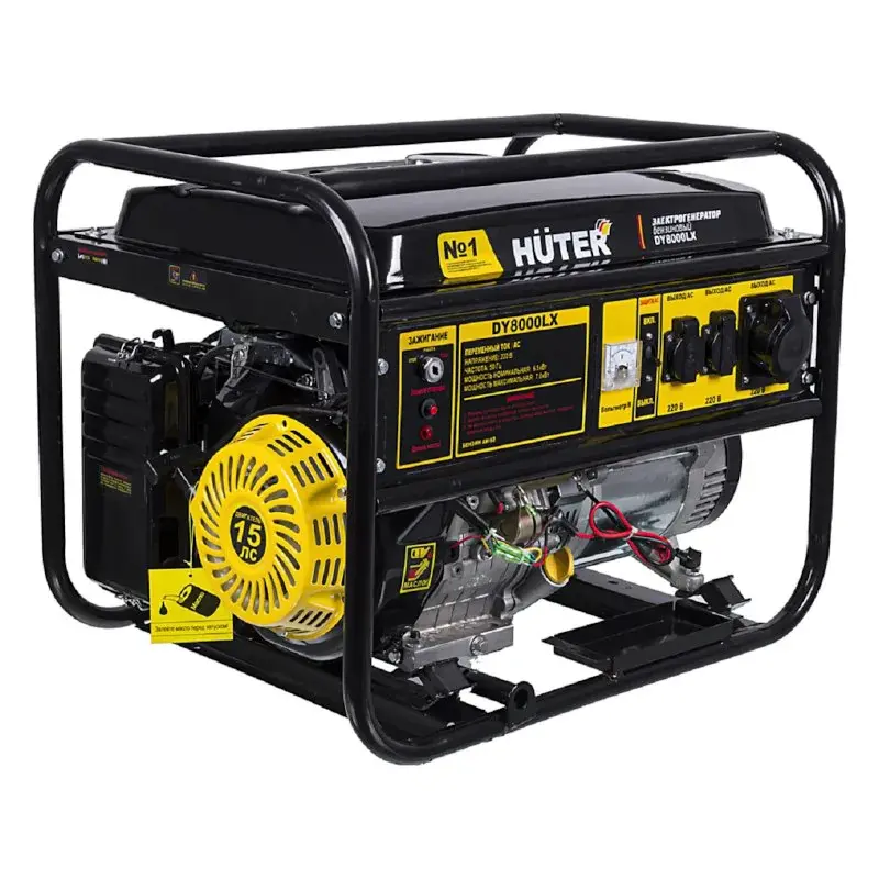 Электрогенератор Huter DY8000LX используется в качестве резервного источника питания для устройств суммарной мощностью до 7500 Вт. Присутствуют 3 однофазные розетки для подключения бытовых приборов и электроинструмента.